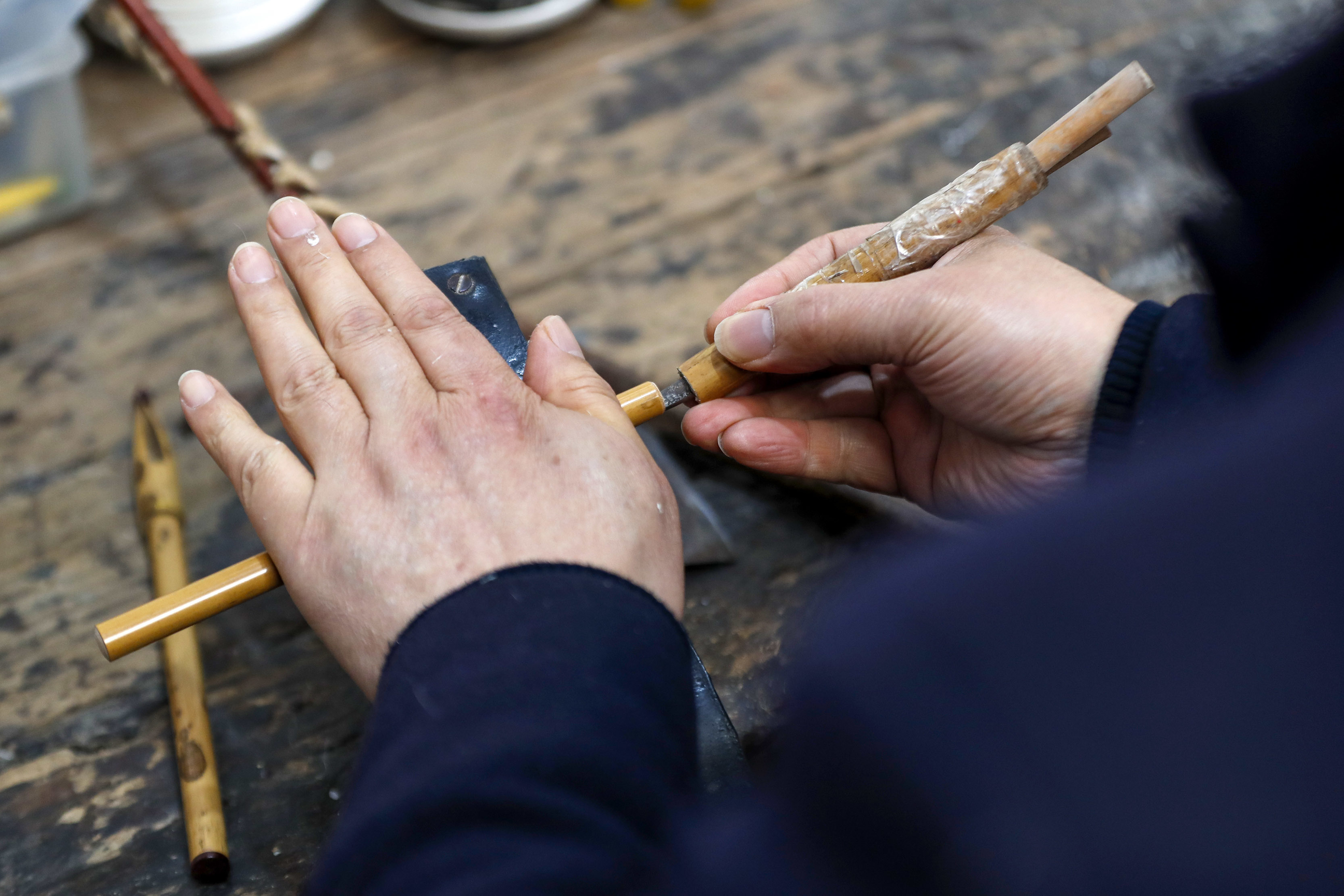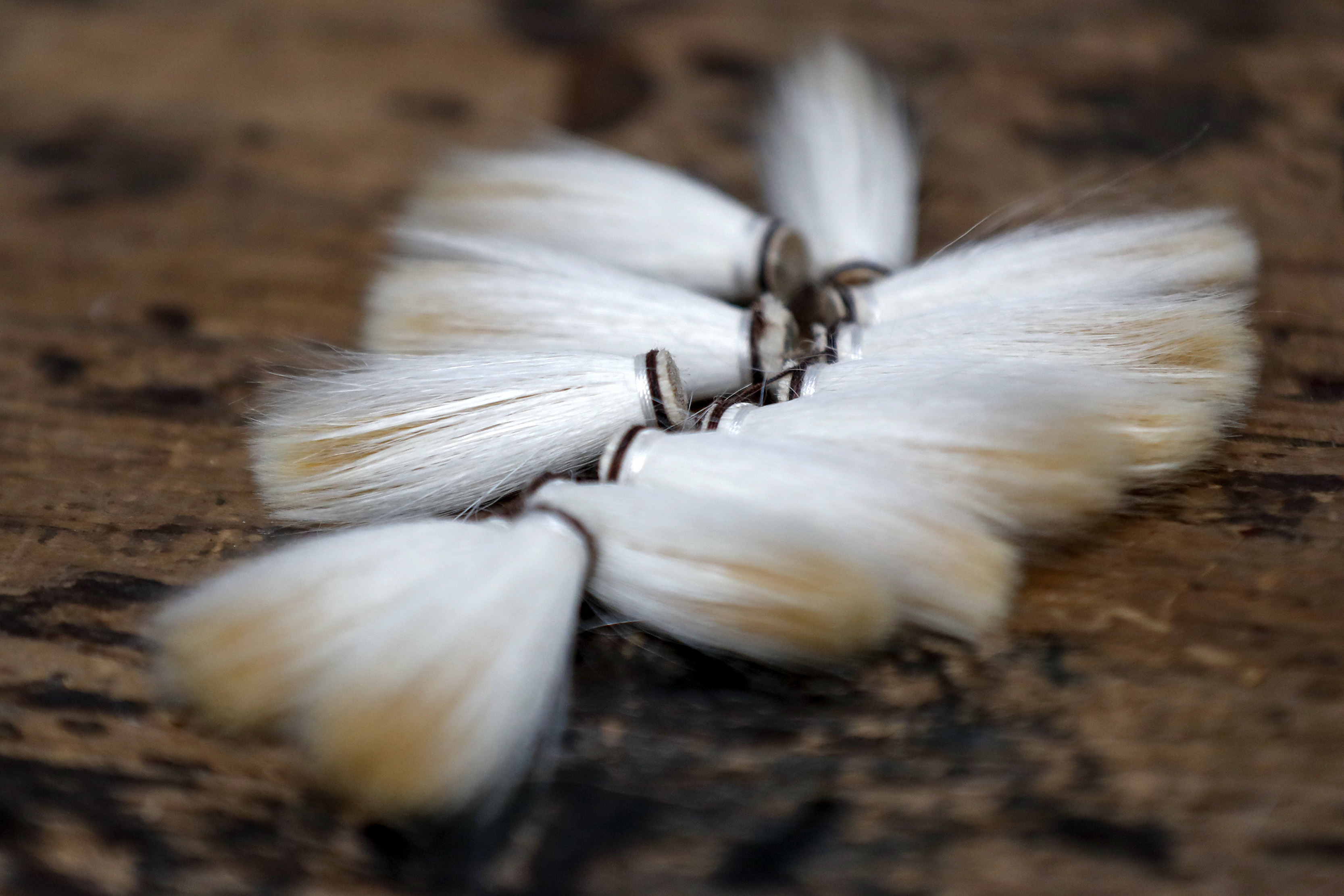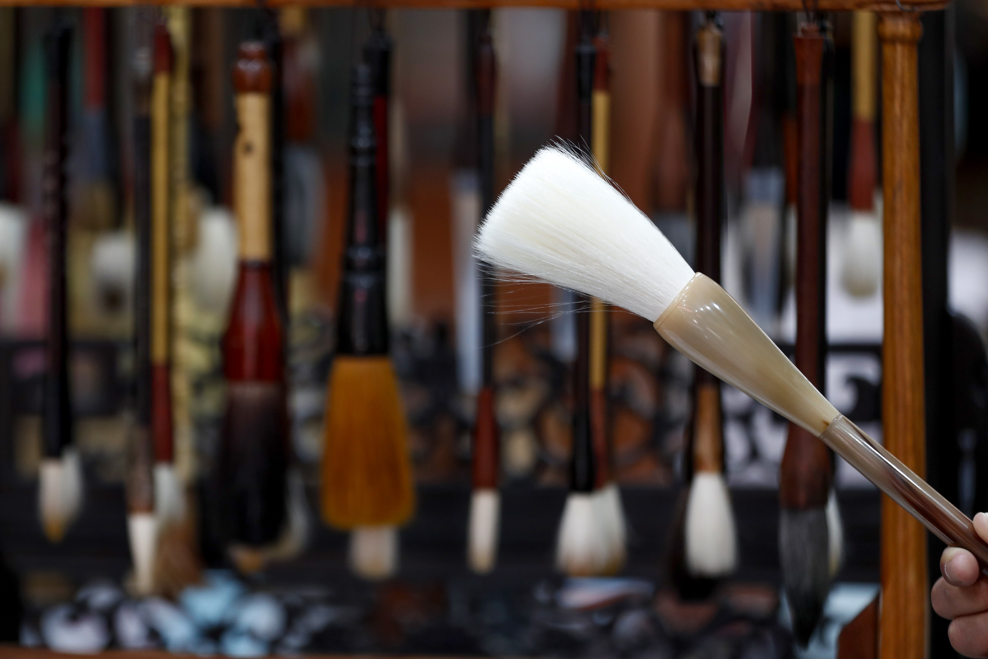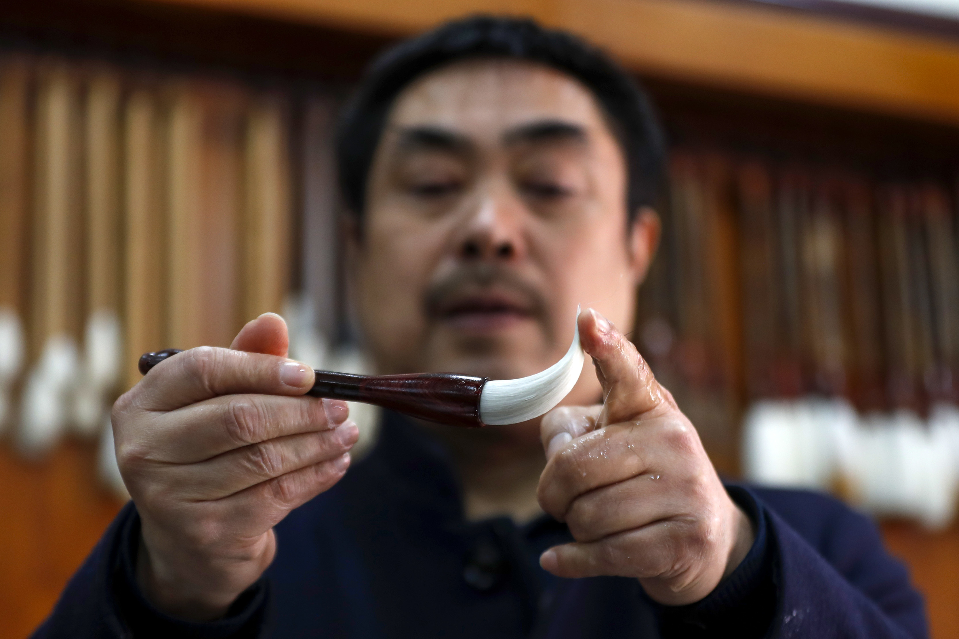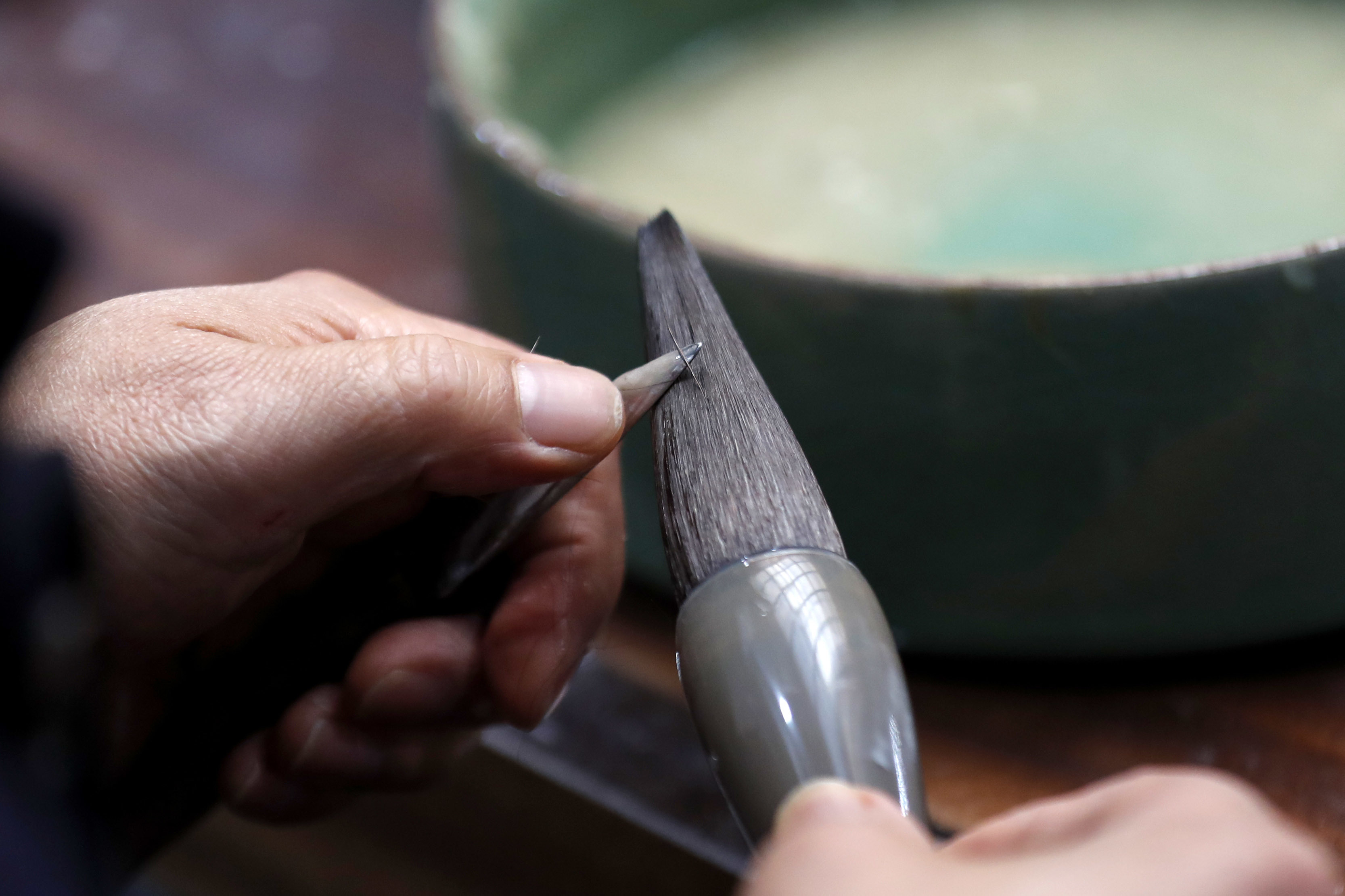 ↑在安徽省黄山市屯溪区,杨文在整理笔头的副毛。CICPHOTO/施亚磊 摄
