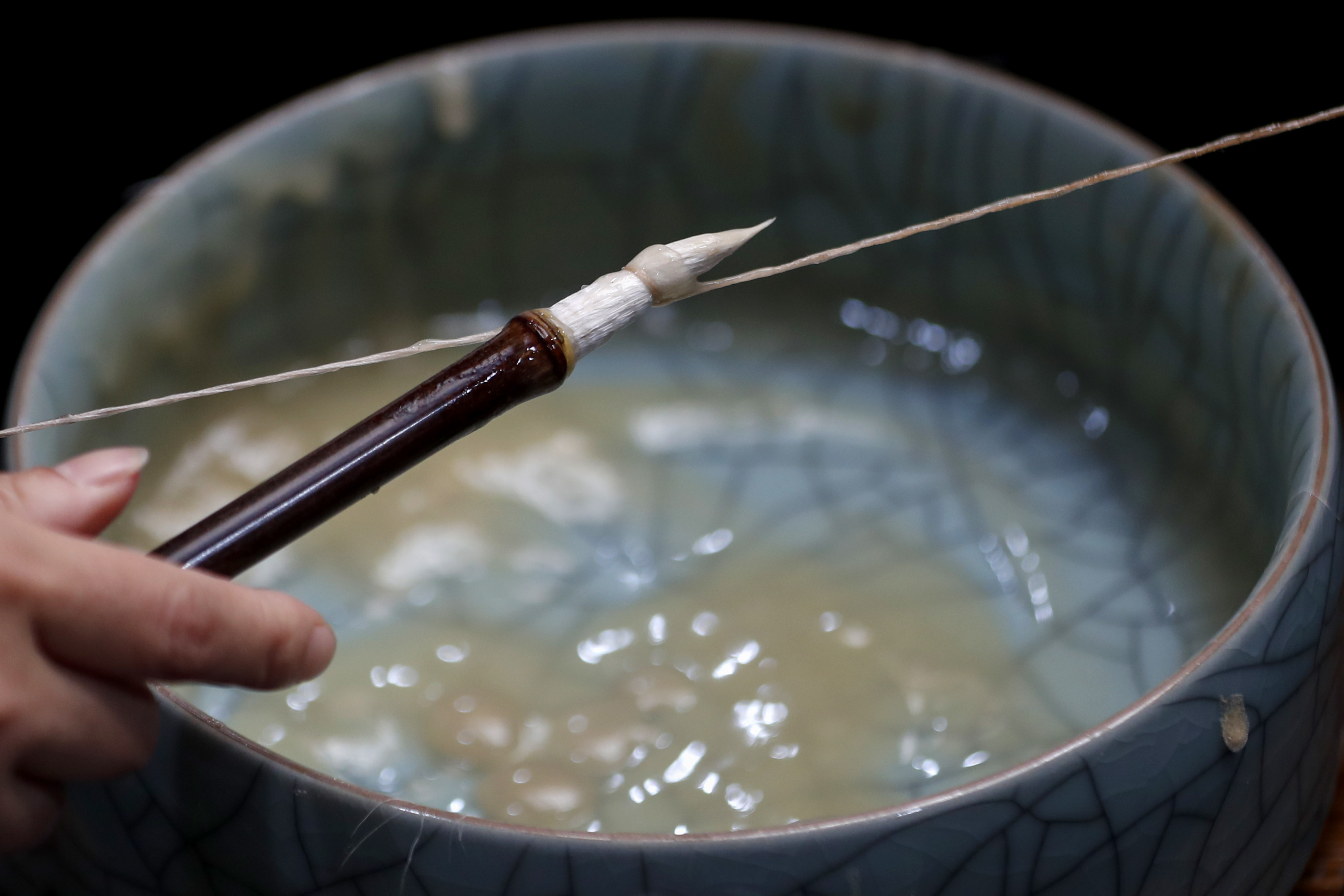 ↑在安徽省黄山市屯溪区,杨文在用棉绳将笔头塑形。CICPHOTO/施亚磊 摄