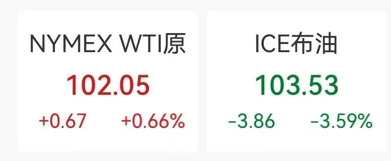 国际油价回落,美油布油昨夜短线跳水,纽约期油现报102美元/桶,涨0.66%,布伦特原油跌3.59%,现报103.5美元/桶。