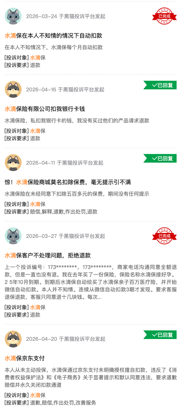 黑猫投诉平台显示,水滴被用户投诉最多的便是“未经同意莫名扣款”“未主动投保被自动扣款”,且中招者多为老年用户。用当事人的观点,“他们不了解全部费用,也看不清密密麻麻的条款,这样的广告对中老年人有极大的误导性。”