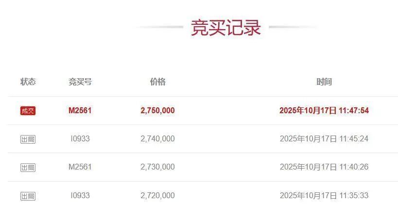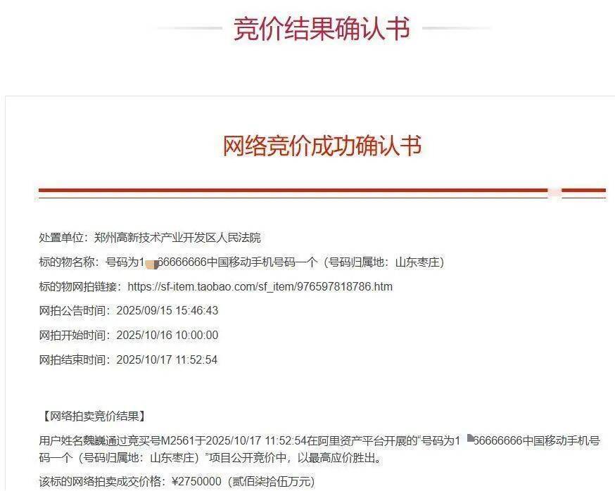 记者联系阿里资产·司法平台,工作人员证实,竞拍人魏某以275万元的拍下价,成功竞拍移动手机号1××66666666。